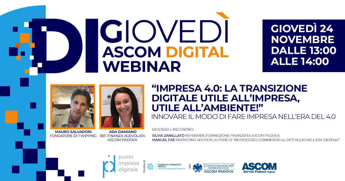 Si terrà giovedì 24 novembre, durante la pausa pranzo a partire dalle 13.00, il webinar dal titolo “IMPRESA 4.0 IMPRESA 4.0: LA TRANSIZIONE DIGITALE UTILE ALL'IMPRESA, UTILE ALL'AMBIENTE”, organizzato da Ascom Servizi Padova spa in collaborazione con la Camera di Commercio di Padova nell’ambito dello sportello PID.