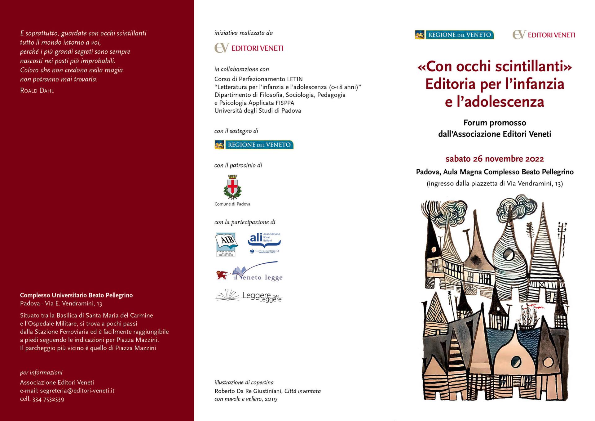 Sabato 26 novembre si terrà l’iniziativa “Con occhi scintillanti” - Editoria per l’infanzia e l’adolescenza, realizzata dall’Associazione Editori Veneti in collaborazione con l’Università di Padova, la Regione, il Comune di Padova e con la partecipazione tra gli altri di Ali Confcommercio, nella rinnovata Aula Magna del Complesso Beato Pellegrino a Padova a partire dalle 9.30.