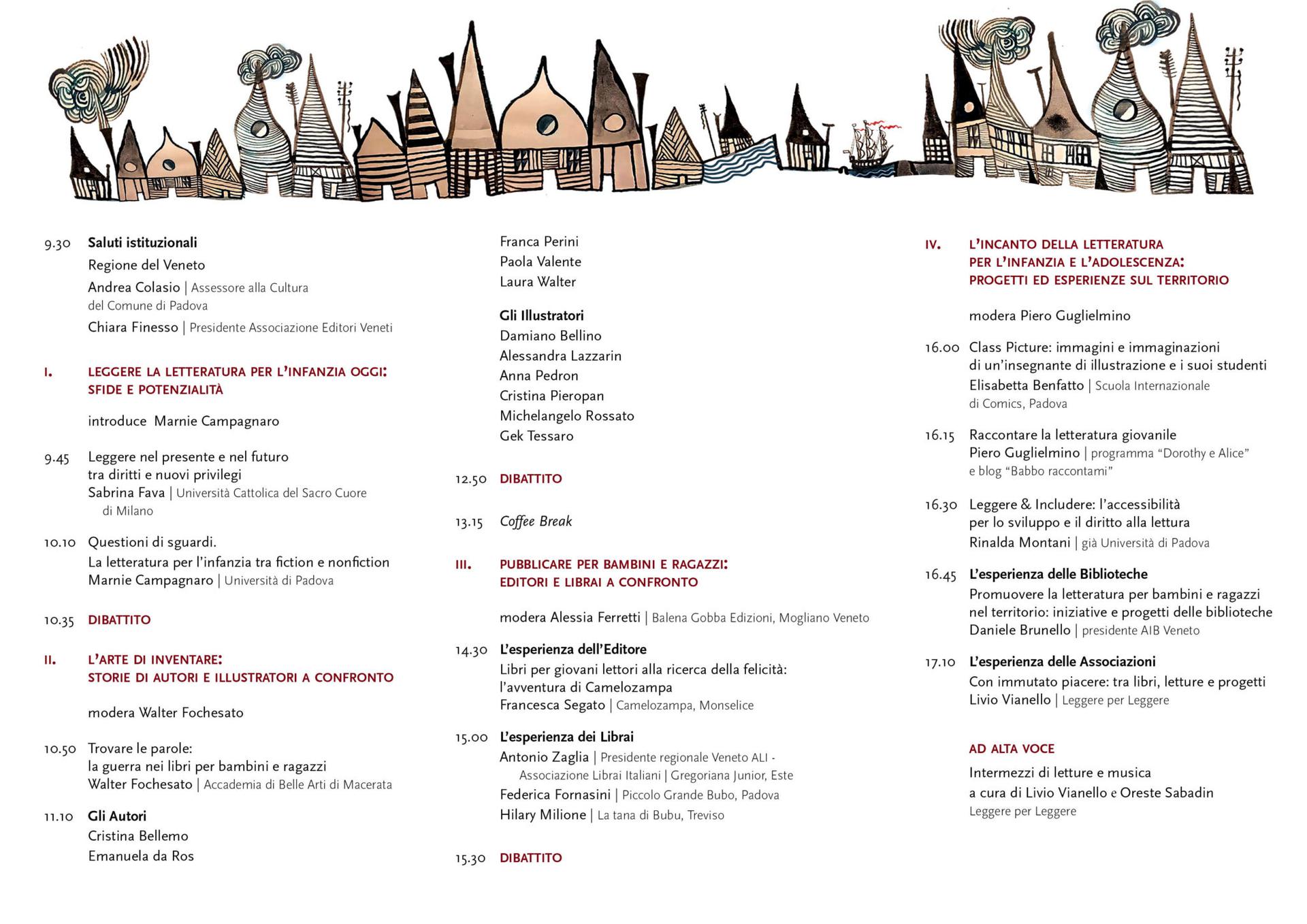 Nel corso della giornata i rappresentanti delle diverse categorie dell’editoria, scrittori illustratori, editori e librai, si alterneranno per discutere le tematiche legate alla letteratura per giovani e più piccoli; tra questi, è previsto alle ore 15 anche l’intervento di Antonio Zaglia, presidente Ali Veneto.