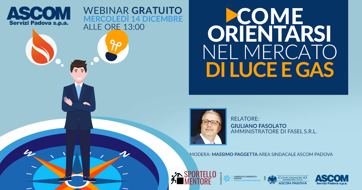 Ultimo webinar gratuito sul tema “COME ORIENTARSI NEL MERCATO DI LUCE E GAS”, organizzato da Ascom Servizi Padova spa in collaborazione con la Camera di Commercio di Padova nell’ambito del Progetto MENTORE.