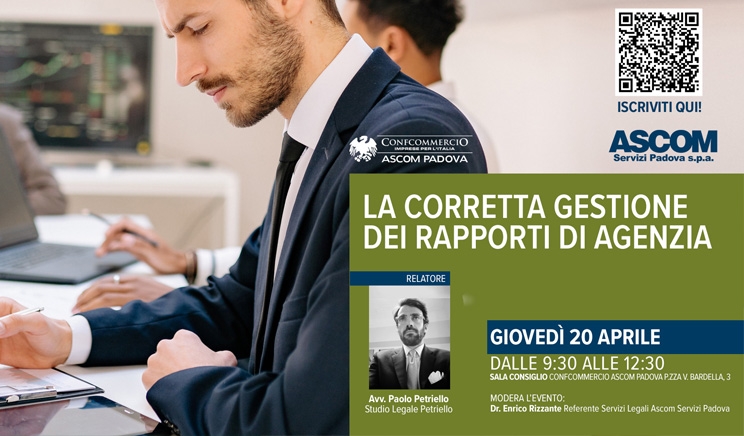 Si terrà giovedì 20 aprile dalle 9.30 alle 12.30 presso la sede di Confcommercio Ascom Padova in Piazzetta Virgilio Bardella 3 il seminario gratuito dedicato ad analizzare il tema dei rapporti di agenzia e della loro corretta gestione.