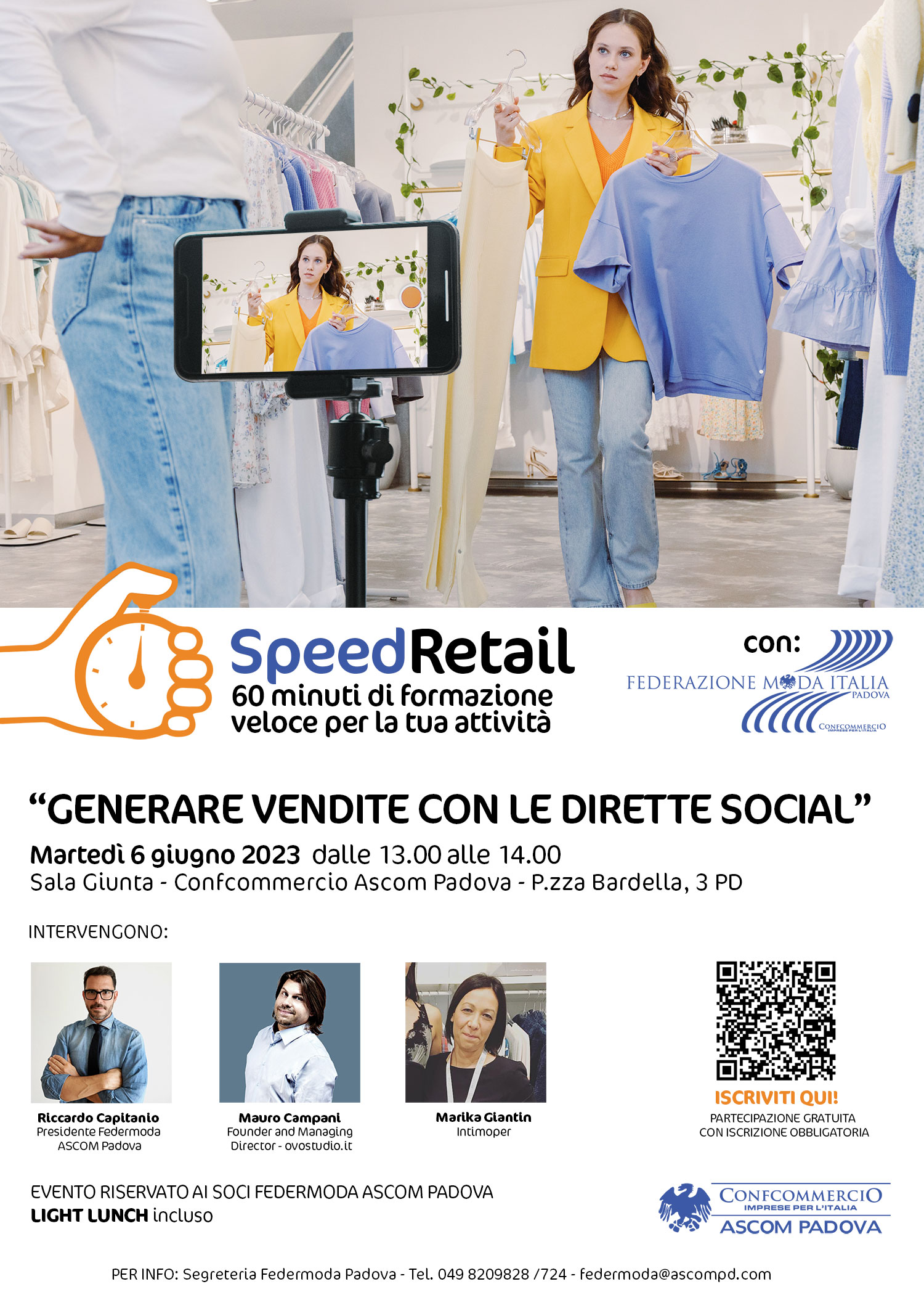 SPEEDRETAIL - 60 minuti di formazione veloce per la tua attività è il format organizzato per Martedì 6 giugno 2023 dalle ore 13,00 – 14,00 dal Gruppo di Federmoda Italia presso la sede di Ascom Padova in piazza Bardella 3.