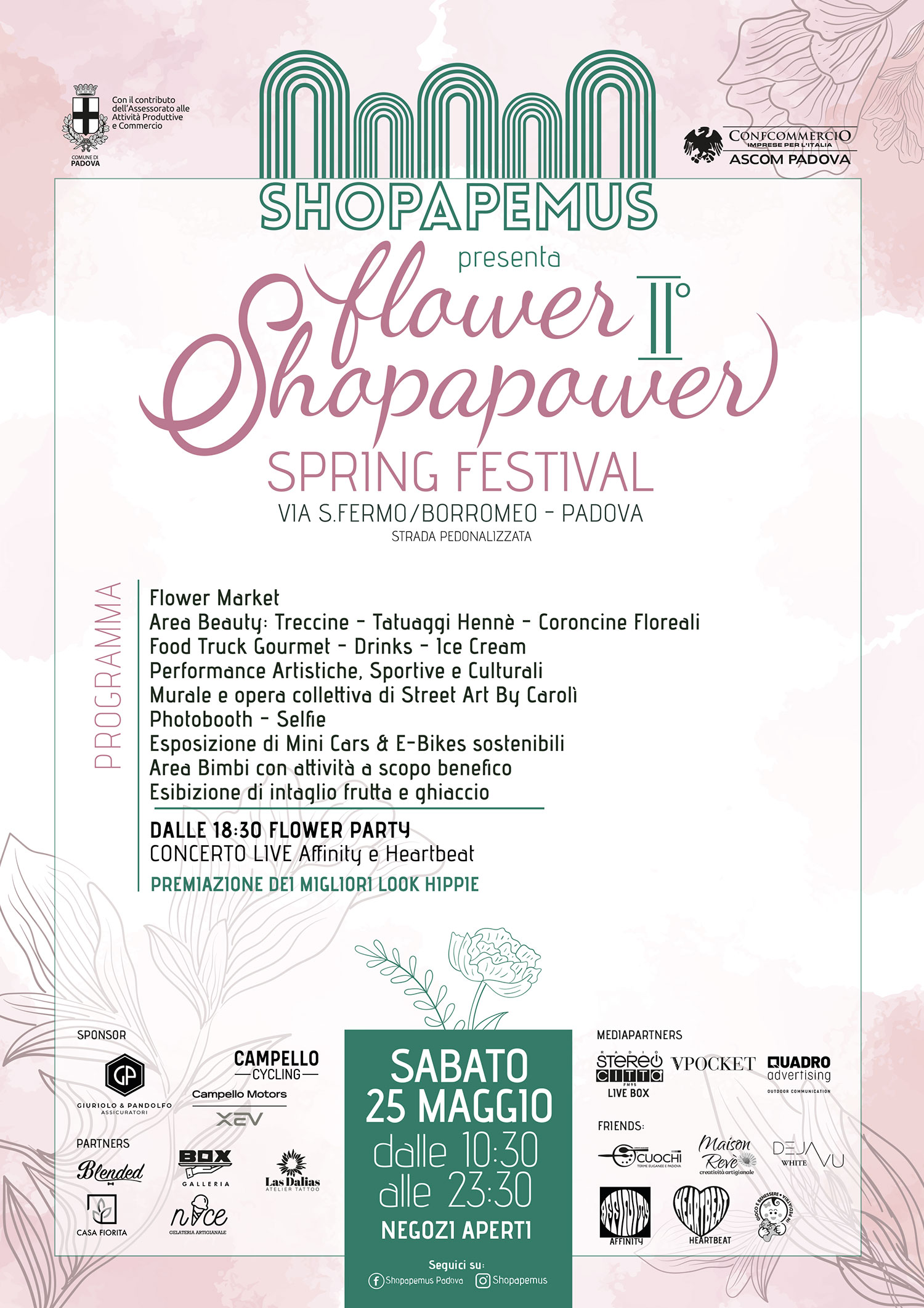 “Flower Shopapower II edizione”. Dopo l’enorme successo della I edizione torna in centro a Padova il festival di primavera, l’unico e originale, che trascinerà i partecipanti con la sua atmosfera ispirata al periodo hippie, ai fiori e a Woodstock’69.