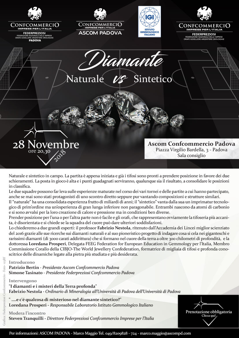Un imperdibile appuntamento organizzato dal Gruppo Gioiellieri e Orafi, in sinergia con Federpreziosi nazionale e IGI, dal titolo “DIAMANTE Naturale Vs sintetico” si terrà mercoledì 28 novembre p.v. alle ore 20,30 in Sala Giunta della sede ASCOM di P.zza Bardella, 3 a Padova.