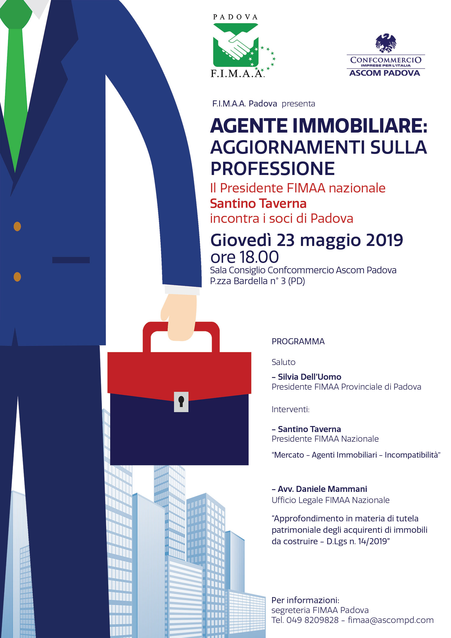 Giovedì 23 maggio alle ore 18.00 nella sede di Confcommercio Ascom Padova in piazza Bardella 3 si terrà l'incontro con gli Agenti Immobiliari di Padova, nel corso del quale il Presidente Nazionale FIMAA Santino Taverna, ospite della presidente di Fimaa Ascom Padova, Silvia Dell’Uomo, avrà modo di incontrare i professionisti del settore.
