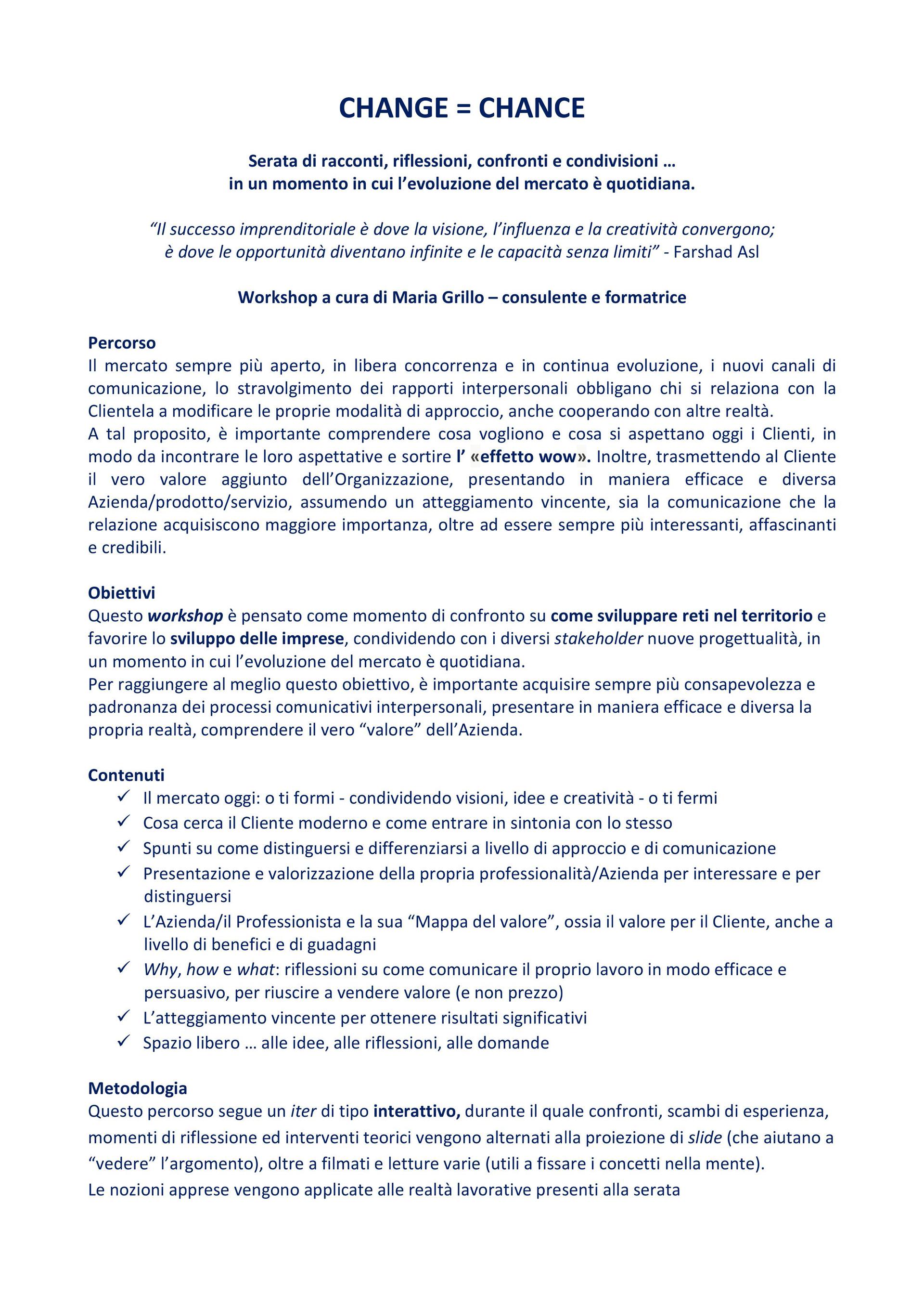 Il titolo del seminario è CHANGE = CHANCE, per fissare opportunamente l'attenzione sulla straordinaria importanza di conoscere, sapere, capire, interagire per crescere. Si parlerà di come far crescere reti sul territorio in modo da favorire lo sviluppo delle imprese, di nuove progettualità condivise e co-progettate con gli stakeholder locali, di comunicazione consapevole ed efficace e di molto altro, in un percorso interattivo che prevede confronti e riflessioni condivise.