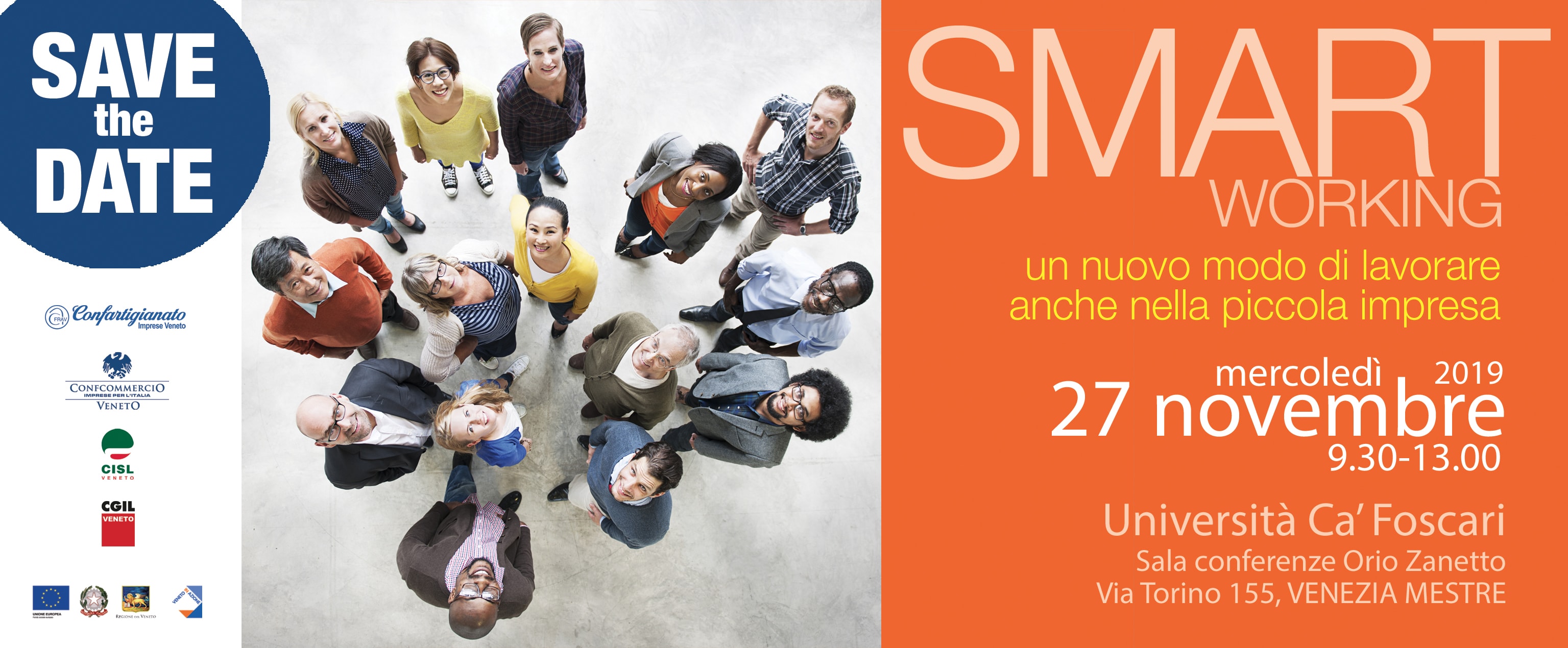 Mercoledì 27 novembre, dalle 9.30 alle 13.00, presso l'Università Ca’ Foscari (sala conferenze Orio Zanetto, via Torino 155 – Mestre VE) verranno presentati i risultati del progetto “LO SMART WORKING NELLE PICCOLE IMPRESE DEL VENETO" e di come questo rappresenti un nuovo modo di lavorare anche per le PMI.