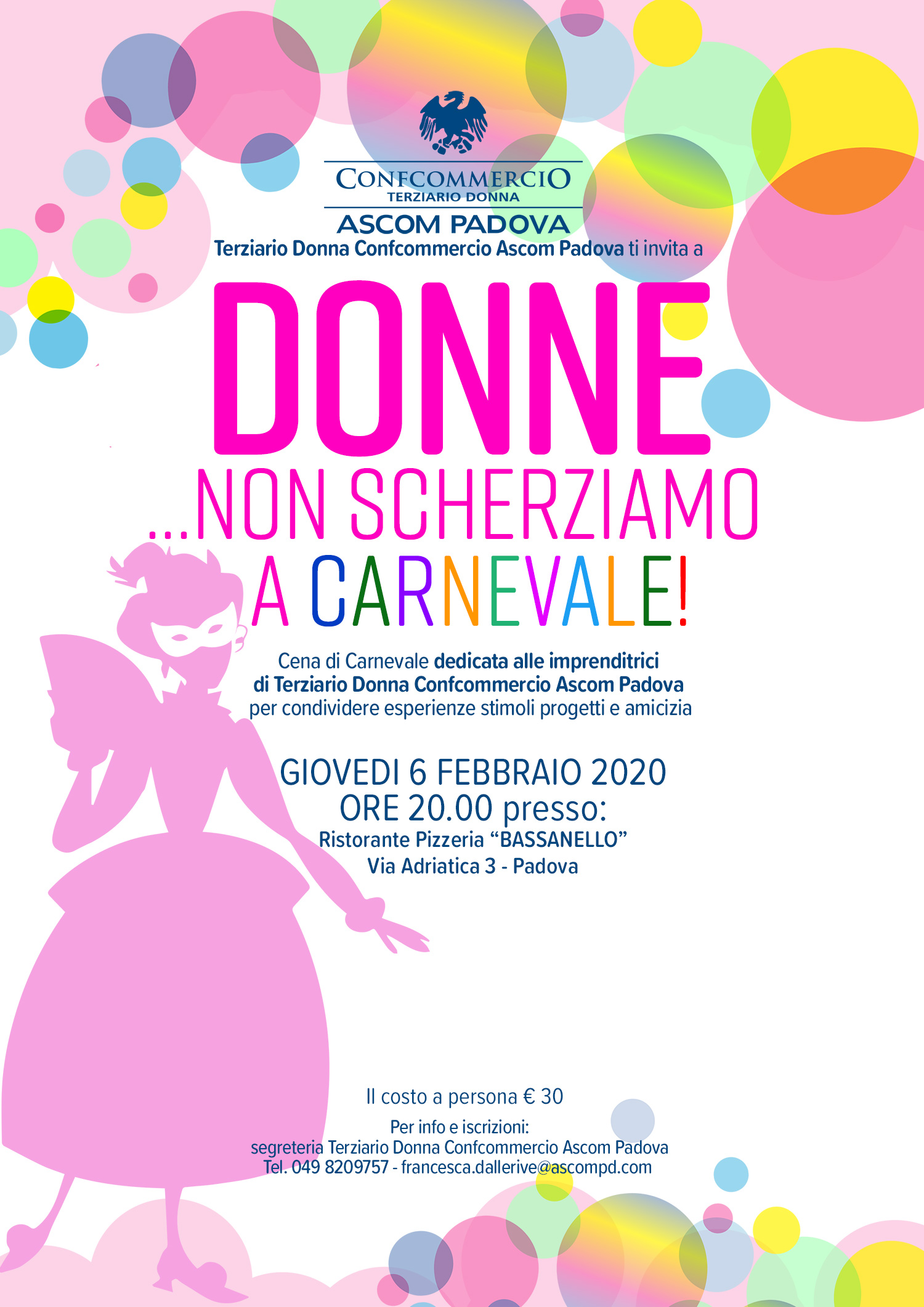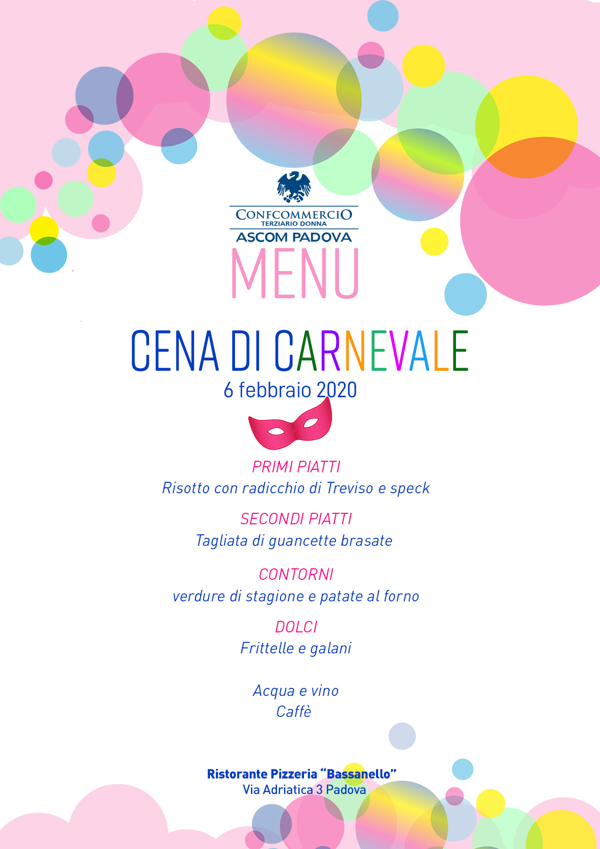 Il Gruppo Terziario Donna Confcommercio Ascom Padova invita le imprenditrici alla “Cena di Carnevale” che si terrà giovedì 6 febbraio 2020 alle ore 20.00 presso il Ristorante Pizzaria “Bassanello” in Via Adriatica 3 a Padova, per condividere esperienze, stimoli, progetti ed amicizia.