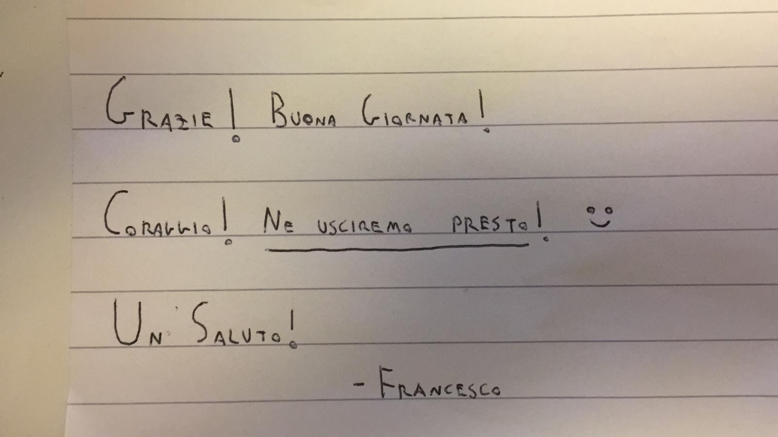 “Questa mattina – spiega Salmaso – nel riordinare la stanza, abbiamo trovato un bigliettino con su scritto: “Grazie! Buona Giornata! Coraggio! Ne usciremo presto! Un saluto! Francesco”. E una faccina sorridente. Se abbiamo ancora la forza per poter continuare lo dobbiamo a queste persone!”