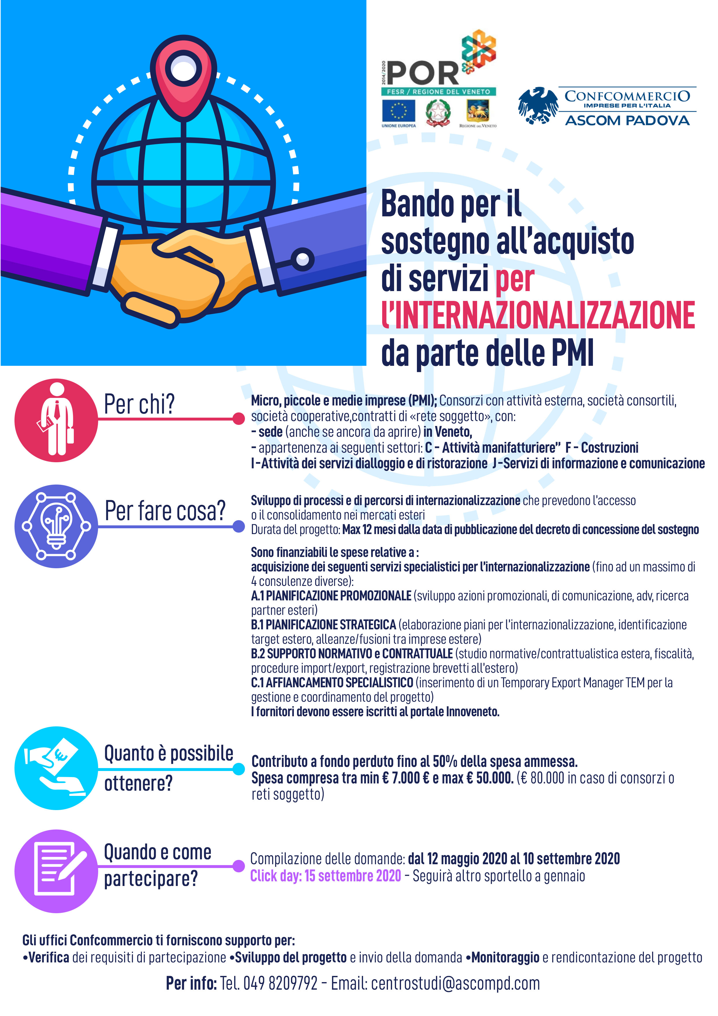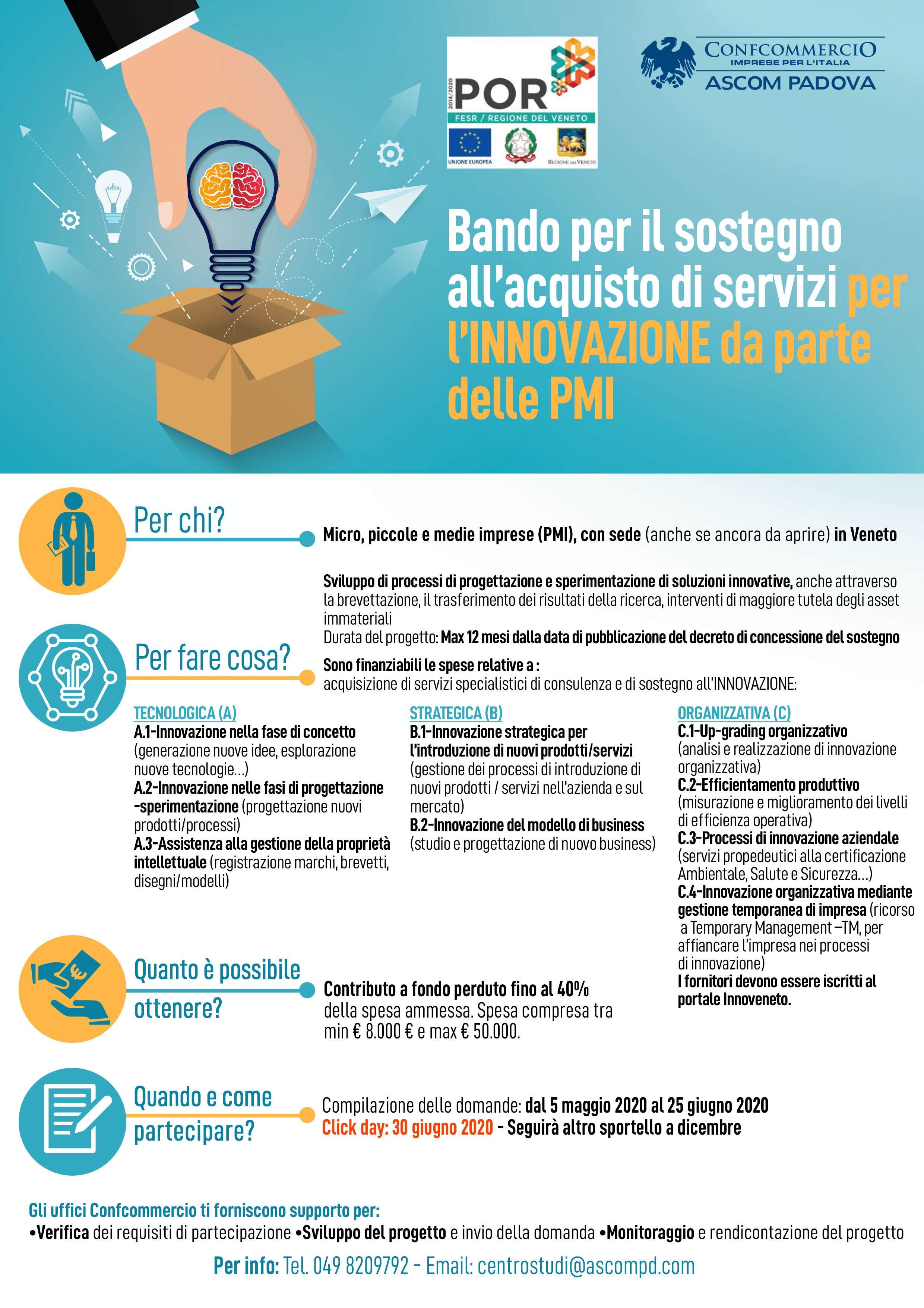 Ascom Servizi Padova s.p.a. può aiutarti a predisporre il tuo progetto di sviluppo, sia in ambito innovazione che internazionalizzazione, e a ottenere i voucher regionali!