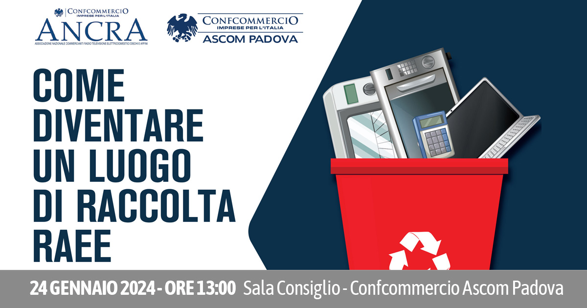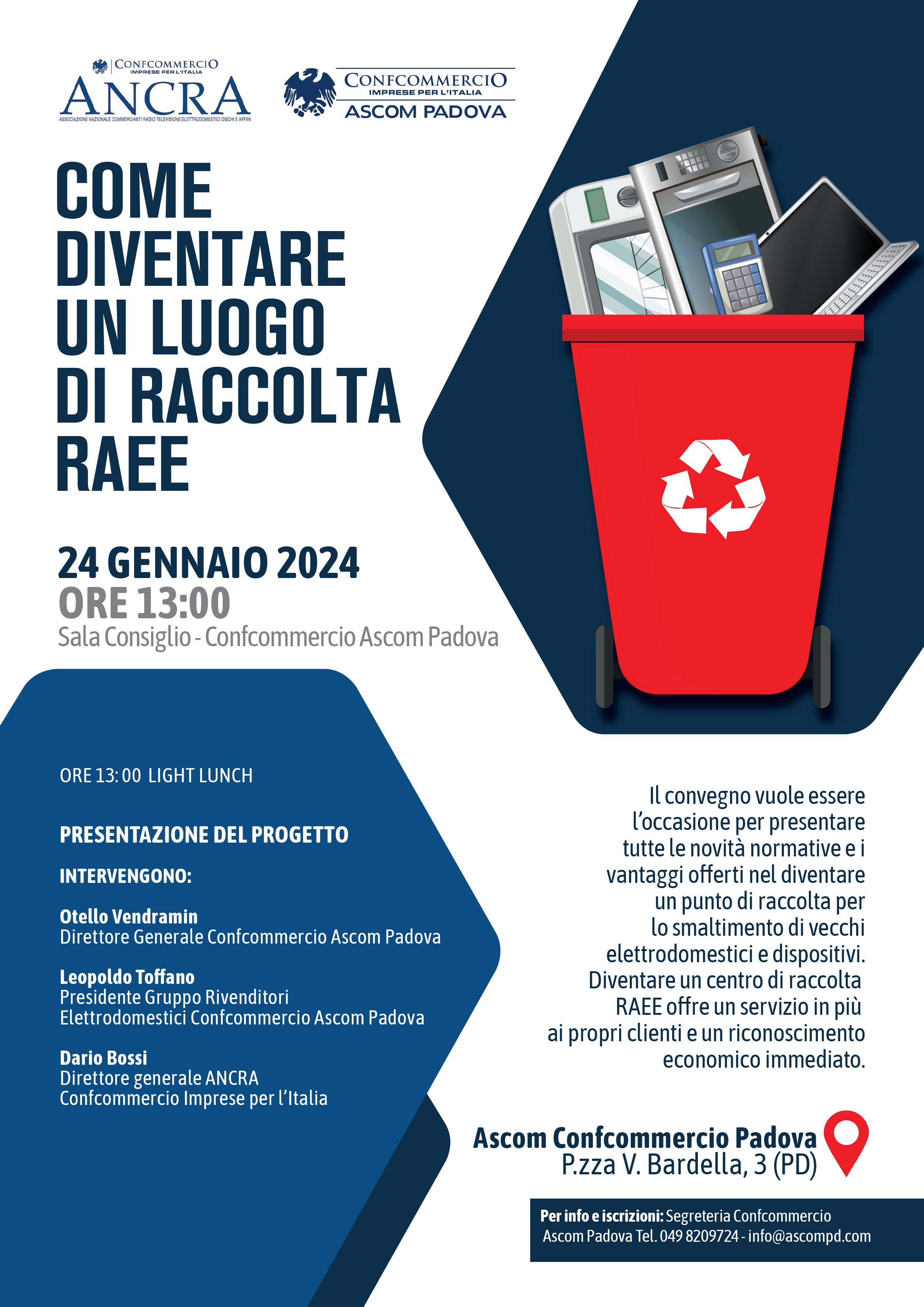 Mercoledì 24 gennaio alle 13 si terrà il convegno “Come diventare un luogo di raccolta RAEE”, organizzato presso la sede di Confcommercio Ascom Padova in piazza Bardella dal gruppo ANCRA, che rappresenta i commercianti di radio televisione elettrodomestici e materiale elettrico.
